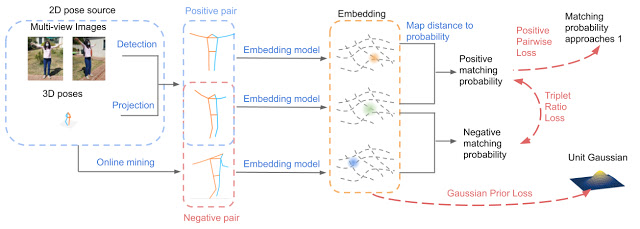 在训练期间,研究人员应用了三种损失(三重比损失,正成对损失,以及在嵌入之前应用的单位高斯的先验损失)。在推理过程中,模型将输入的2D姿态映射到概率的视图不变嵌入。