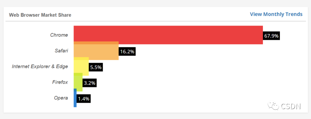 在曾经市场份额疯长到全球第二的 Firefox 浏览器日益变“糊,并且如今市场占有率已不足 4% 的形势下,2008 年诞生的 Chrome 浏览器依旧深受用户喜爱:据 W3Counter 最新统计,Chrome 以 67.9% 的市场份额稳居第一。