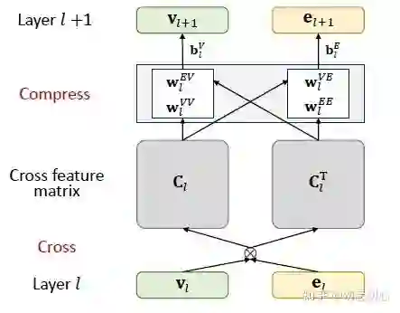 交叉压缩模型的结构如图五所示,将知识图谱边编码模型的头节点与推荐模型的物品编码作为输入。首先,将两个向量相乘得到交叉向量 ,认为交叉向量包含了二者之间所有可能的交互。然后,将矩阵乘以参数向量进行压缩,重新得到维度与交叉压缩模型的输入向量维度相同的输出向量,从而完成了一次前向传播。