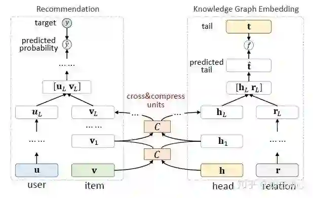依次训练指的是知识图谱首先通过embedding得到实体与关系向量,然后引入推荐系统学习用户向量与物品向量,进行模型训练。知识图谱的embedding与推荐系统的训练是依次进行的。依次训练的代表方法为Deep Knowledge-aware Network (DKN)。