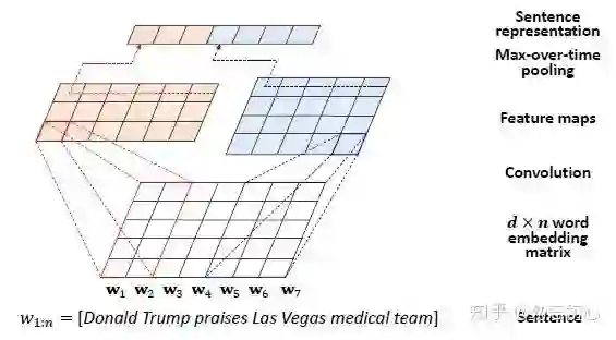 在提取句子特征上,本文使用了最近流行的CNN方法KCNN 。具体的,将每个句子映射到一个 空间,其中d代表单词的维度,n代表句子中单词的个数,如图一所示,可以通过两个不同的卷积核进行特征提举,将最终得到的表示进行拼接即可。