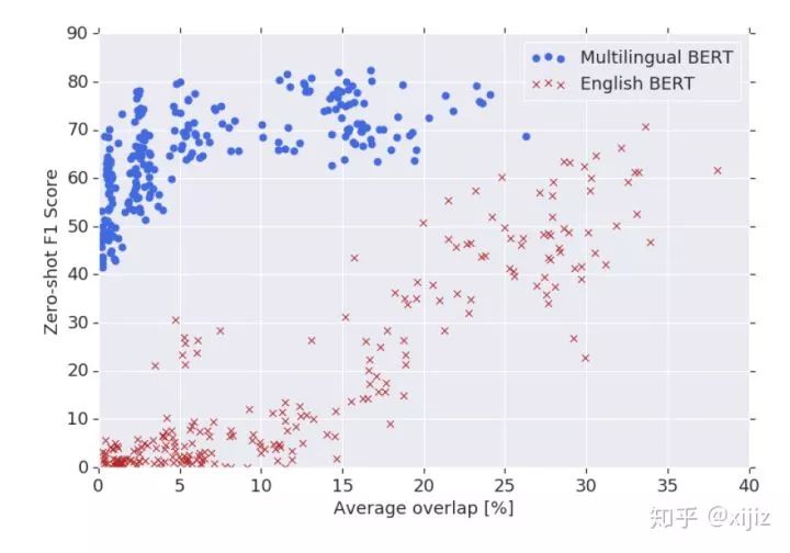 如图3-2,该示意图是零样本NER迁移学习F1分数与16种语言重叠实验的对比结果,包含了多语言BERT和英文BERT。我们可以看到英文BERT的性能表现非常依赖于词汇重叠,迁移学习的能力会随着重叠率的下降而逐渐下降,甚至在完全不同的语言文本中(即重叠率为0)出现F1分数为0的情况。但是多语言BERT则在大范围重叠率上表现得非常平缓,即使是不同的语言文本,这证明多语言BERT在某种程度上拥有超过浅层词汇级别的深层次表征能力。
