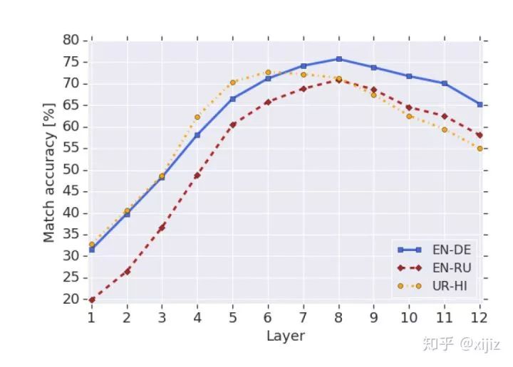 如图3-7所以,该图是翻译任务上的最近邻准确度在BERT每一层网络上的结果。我们可以看到,在BERT的非底层网络都实现了较高的准确率,这说明多语言BERT可能一种语言无关的方式,在大多数隐藏层共享语言特征表示。至于为什么在最后几层网络上准确率又下降了,一个可能的解释就是BERT在预训练的时候需要明确与语言相关的信息去预测缺失的单词。