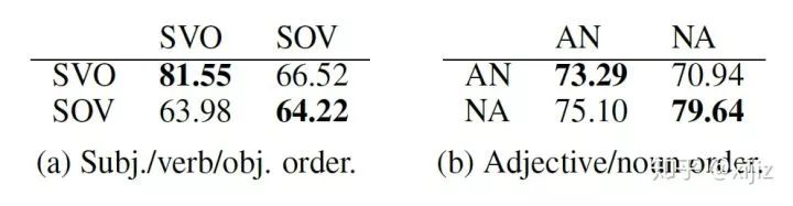 语言的顺序类型特征一般包括这两种,主谓宾(subject/verb/object, SVO)顺序或者形容词名词(adjective/noun, AN)顺序。图3-5展示了在POS任务上进行的跨语言迁移学习的宏平均准确率与语言类型特征的对比。我们可以看到性能表现最好的情况是语言类型特征一样(SVO和SVO,SOV和SOV,AN和AN以及NA和NA)的迁移学习,这表明虽然多语言BERT能够学习到一定的多语言表征,但是似乎没有学习到这些语言类型结构的系统转换去适应带有不同语言顺序的目标语言。
