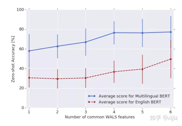 WALS是与语法结构相关的特征,图3-4展示了多语言BERT在零样本迁移学习上POS任务的准确率与WALS特征数量的对比图。我们可以看到,准确率会随着语言相似度的提升而提升,这证明多语言BERT对具有相似特征的语言的迁移学习更加友好。