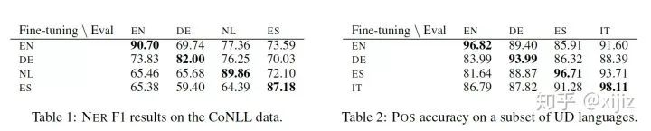 本文尝试着回答这些问题,作者基于Devlin et al发布的用104种语言组成的单一语料库训练的单个多语言BERT模型,在上面做了一系列实验,最终结果显示多语言BERT在跨语言的零样本迁移学习上表现得非常好。作者设计了一些标注任务,这些任务在一种语言上对该任务进行微调,最后再在另一种语言上进行评估。