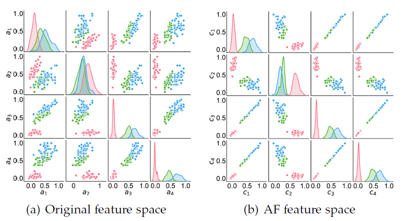 图 3 Iris 数据集在原始空间和 AF 空间中的散点图与可分性