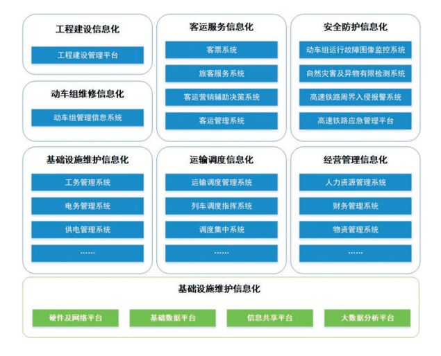 高速铁路客运服务领域信息化建设已覆盖售票、营销、自动售检票、候车、列车服务等出行全流程,形成了成套的产品体系,主要包括:新一代铁路客票系统、客运营销辅助决策支持系统、铁路旅客服务系统和客运管理信息系统等。