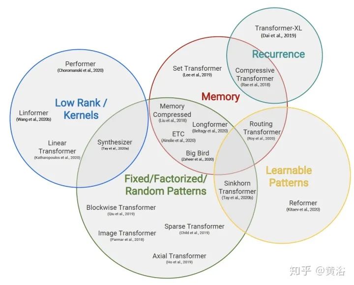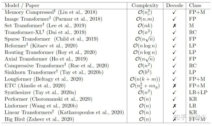 注:FP = Fixed Patterns/Combinations of Fixed Patterns, M = Memory, LP = Learnable Pattern, LR = Low Rank, KR = Kernel, RC = Recurrence.