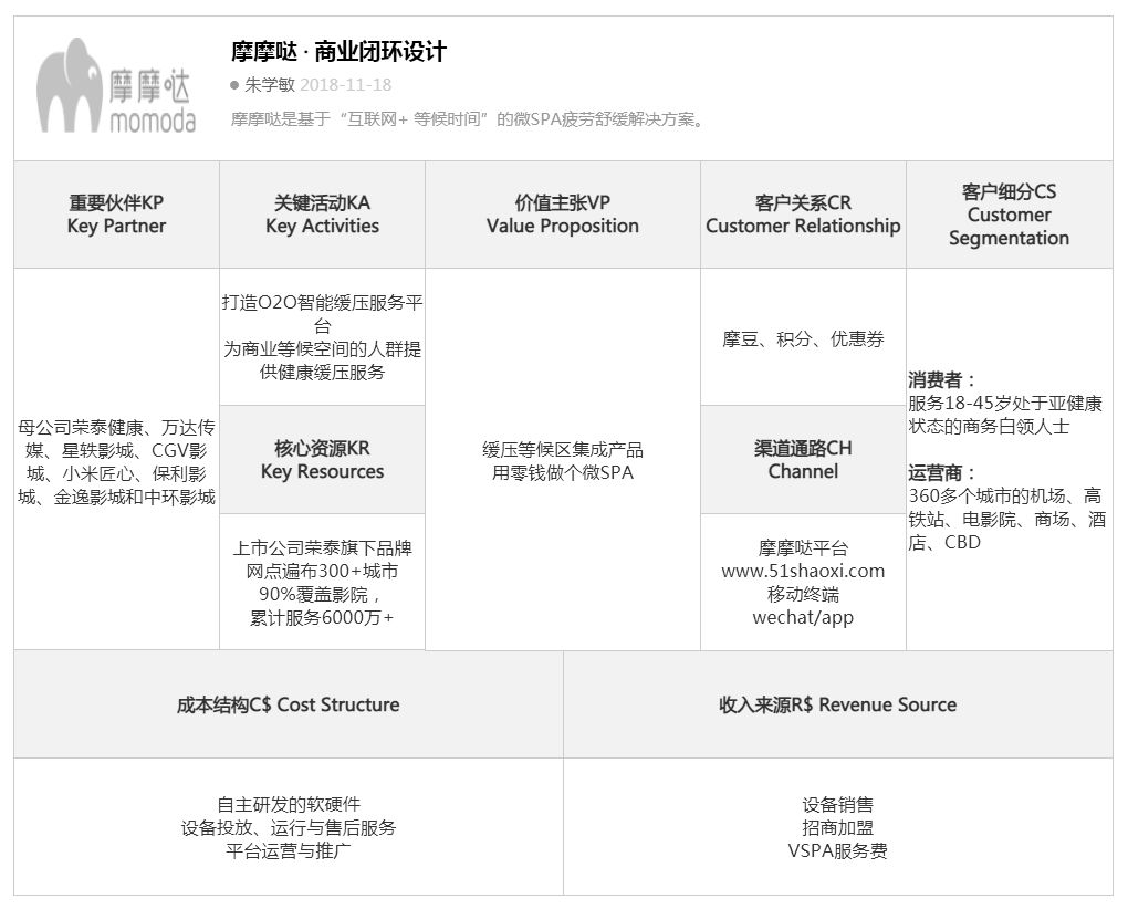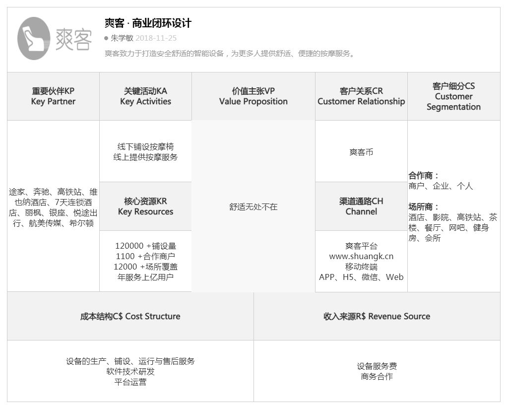 客户细分CS:消费者: 服务18-45岁处于亚健康状态的商务白领人士 运营商:360多个城市的机场、高铁站、电影院、商场、酒店、CBD;