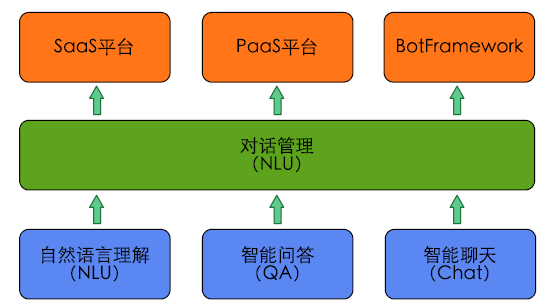 典型的智能对话交互框架如图 1 所示。其中,语音识别模块和文本转语音模块为可选模块,比如在某些场景下用户用文本输入,系统也用文本回复。自然语言理解和对话管理是其中的核心模块,广义的自然语言理解模块包括对任务类、问答类和闲聊类用户输入的理解,但在深度学习兴起后,大量端到端(End-to-End)的方法涌现出来,问答和聊天的很多模型都是端到端训练和部署的,所以本文中的自然语言理解狭义的单指任务类用户输入的语义理解。在图 2 所示的智能对话交互核心功能模块中,自然语言理解和对话管理之外,智能问答用来完成问答类任务,智能聊天用来完成闲聊类任务。在对外输出层,我们提供了 SaaS 平台、PaaS 平台和 Bot Framework 三种方式,其中 Bot Framework 为用户提供了定制智能助理的平台。