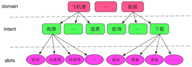在智能对话交互中,自然语言理解一般采用的是 frame semantics 表示的一种变形,即采用领域(domain)、意图(intent)和属性槽(slots)来表示语义结果,如图 3 所示。