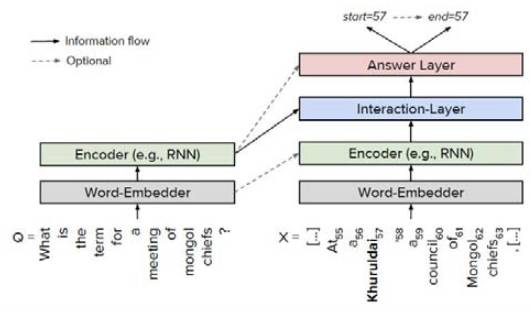 在阅读理解的方法上,目前针对斯坦福大学的数据集 SquAD,有大量优秀的方法不断涌现,比如 match-LSTM[15]、BiDAF[16]、DCN[17]、 FastQA[18] 等。文献 [18] 给出了目前的通用框架,如图 11 所示,主要分为 4 层:① Word Embedder,对问题和文档中的词进行 embedding;② Encoder,对问题和文档进行编码,一般采用 RNN/LSTM/BiLSTM; ③ Interaction Layer(交互层),在问题和文档之间逐词进行交互,这是目前研究的热点,主流方法是采用注意力机制(attention);④ Answer Layer(答案层),预测答案的起始位置和结束位置。