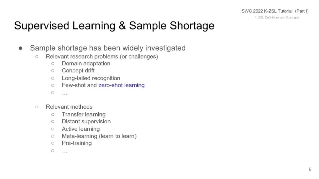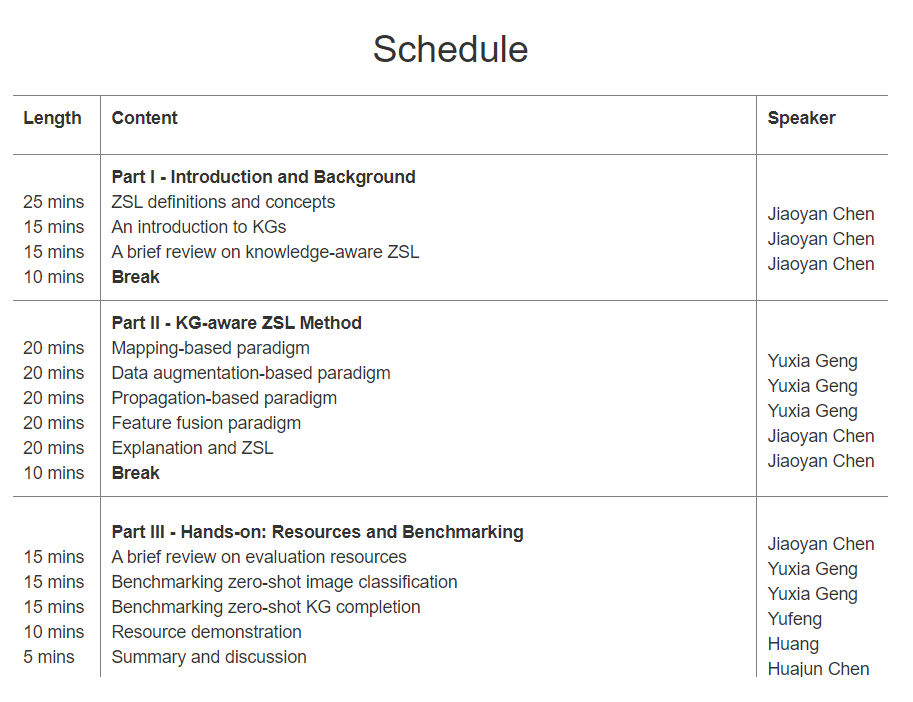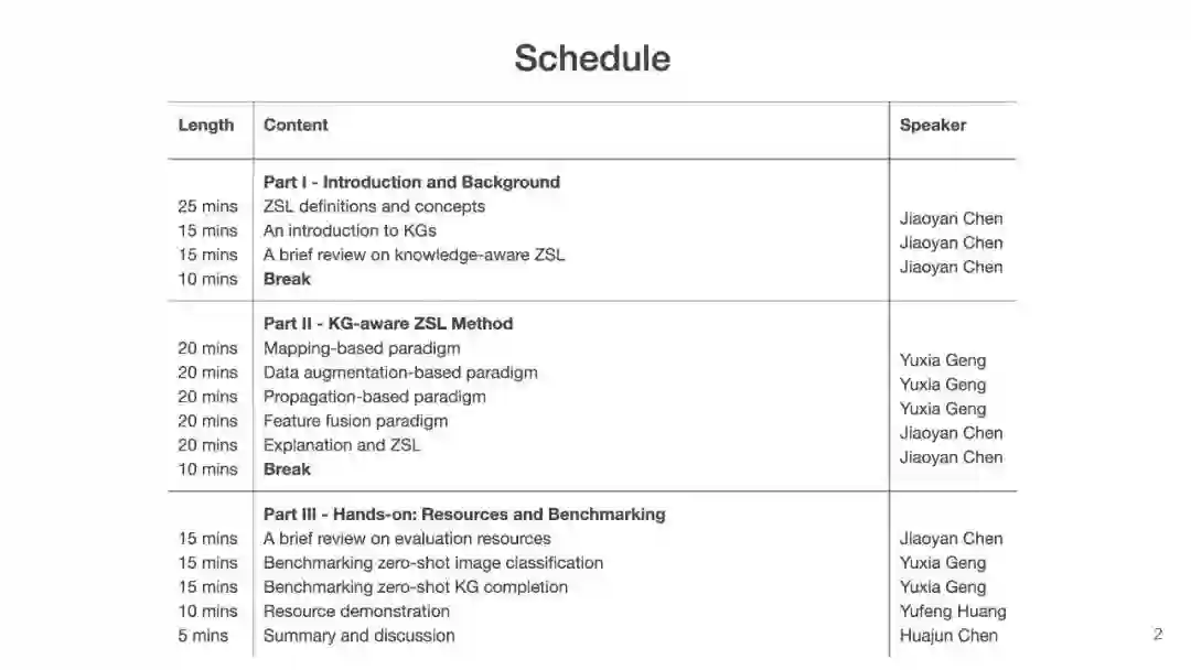 零样本学习(Zero-shot Learning, ZSL)能够使机器学习模型在不看到训练样本的情况下预测新目标,在计算机视觉(computer vision, CV)和自然语言处理(natural language processing, NLP)等许多领域引起了广泛的研究兴趣。一种有效的解决方案是利用文本、属性描述和知识图谱(knowledge Graphs, KGs)等外部知识来弥合有训练样本的目标与无训练样本的目标之间的差距。本教程旨在从知识特别是KG的角度介绍ZSL。我们将首先介绍KG和ZSL的背景,然后通过案例研究介绍支持KG的ZSL的总体情况和一些有代表性的范例,最后提供一个关于基准测试和代码的实践环节。