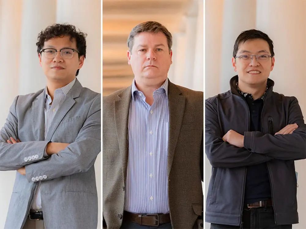 UVA化学助理教授张森(左)和联邦化学教授T. Brent Gunnoe(中)正在领导一项研究项目,该项目旨在提高新太阳能技术的基础知识。张森实验室的四年级研究生刘畅(右)是他们在《自然催化》上发表的这篇论文的第一作者。