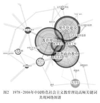 在图2中,各个点和以点为圆心所形成的圆代表了不同的关键词,相互之间的连线则表示他们之间的联系。不同圆的半径长度表示关键词频次的大小,圆的半径越长,则表示关键词的所出现的频次就越高。图中字体的大小则表示了关键词中心性的高低,即字体越大,就表示该关键词在中国特色社会主义教育理论研究中的中心性越强。关键词的中心性指的是该关键词与其他关键词共同出现的几率,一个关键词的中心性越强,则该词与其他关键词所同时出现的概率就越大。从关键词共现的基本原理上来说,在图2当中所明显呈现出来的几个关键词,就表明了改革开放以来中国特色社会主义教育理论研究的热点:“教育理论”、“现代化建设”和“思想政治教育”占据了最明显的位置。