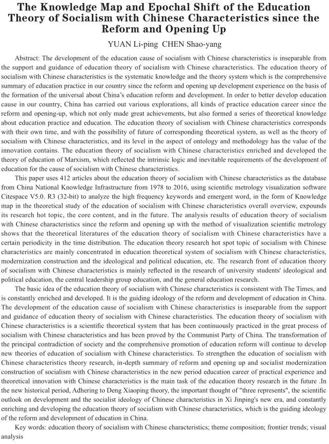 中国特色社会主义教育事业的发展离不开中国特色社会主义教育理论的支撑与指导。基于Citespace的中国特色社会主义教育理论可视化分析,为我们提供了一个认识这一研究主题的新视角,使我们不但可以清晰地看到改革开放以来中国特色社会主义教育理论研究的知识结构,还可以看到相关文献所呈现出来的中国特色社会主义教育理论研究的核心主题,而且可以洞见未来中国特色社会主义教育理论研究的发展趋势。