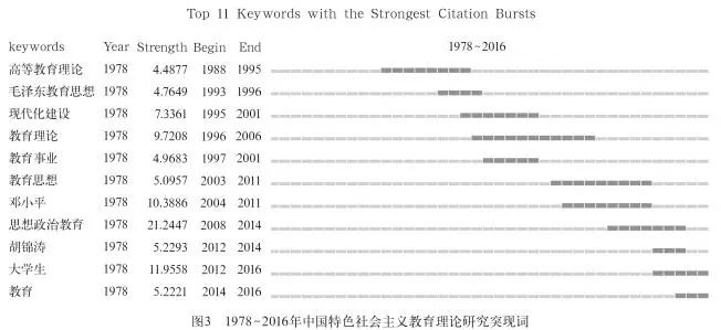 在Citespace生成的高频关键词共现网络图谱的基础上,运用Burstness功能,即可得到1978~2016年中国特色社会主义教育理论研究突现词,如图3所示。