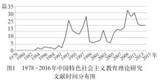 在所设定的检索条件下,相关文献的时间分布区间为1978~2016年。以发文量(单位:篇)为纵坐标,以时间(单位:年)为横坐标,可以绘制出中国特色社会主义教育理论研究文献时间分布图(见图1)。