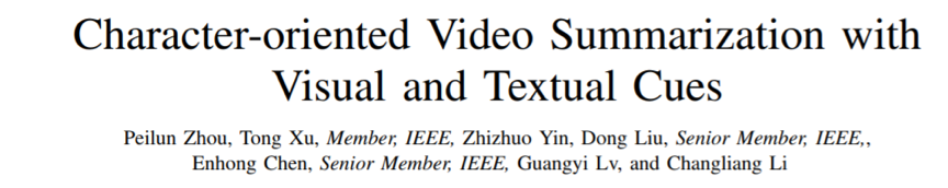Peilun Zhou, Tong Xu, Zhizhuo Yin, Dong Liu, Enhong Chen, Guangyi Lv, Changliang Li, Character-oriented Video Summarization with Visual and Textual Cues, IEEE Transactions on Multimedia, 2019