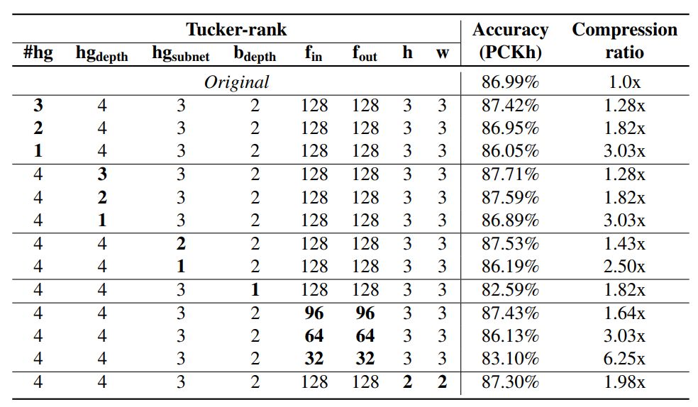 表2:人体姿势估计任务。每种模式下8阶权重张量的冗余性研究。研究人员通过降低每一维度在Tucker张量中的相应秩来对其进行压缩。报告的准确率以PCKh表示。