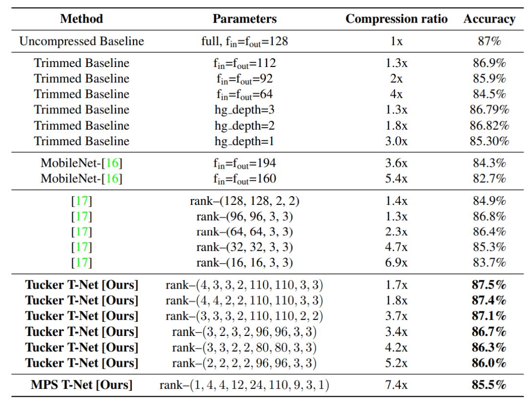 表3:人体姿势估计任务。T-Net与不同基准和当前最先进方法的比较。准确率以PCKh表示。对于基于张量分解的方法,研究人员展示了秩,对于其他方法,研究人员展示了卷积层中通道的数量。