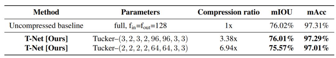 表4:人脸分割任务。一个网络具有与压缩网络相同的架构和特征数,T-Net与该网络之间的比较。即使是在高压缩率下,本文提出的方法依然能够保持高准确率。