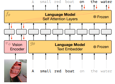 正如前文所述,自回归语言模型的参数是固定的。作者们在实验中中发现,在小数据集场景下如果同时微调自回归语言模型,反而会损害泛化性能。视觉编码器的参数是通过训练过程中的梯度进行更新的,原因是语言模型和视觉编码器的结构和训练方式完全不同,需要通过训练视觉编码器,将视觉输入转化为语言模型能够“看懂”的输入形式,也就是所谓的Prompt。