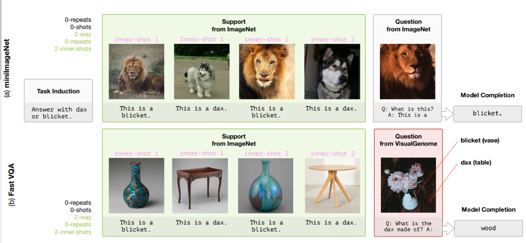 概念对应是人类在认知过程中极为重要的能力。当我们牙牙学语时,爸爸妈妈可能会指着一头狮子告诉我们这个”东西”叫“狮子”。教授几次过后,当我们再次看到狮子时,就能叫出“狮子“。在小样本学习中,概念对应是非常重要的一步。作者们在miniImageNet和FastVQA数据集上开展实验。由于在预训练过程中模型已经见到过大量的文本和图像的对应数据,无法看出模型快速对应新概念的能力。作者们首先将视觉类别对应的文本替换为无意义的词汇,之后提供少量视觉类别的样例和对应的词汇,让模型根据少量样例完成概念的对应,具体示例如下图: