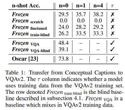 本文的模型是在图像-标题数据集上进行训练的。现实场景中多模态任务种类繁多。作者们希望研究在图像-标题数据集上训练的模型,能否迁移到其他多模态任务(e.g. VQA) 上取得好的表现(这就好比在维基百科上训练掩码语言模型任务的模型,能够迁移到下游的各种分类任务上)。在VQA v2数据集上的结果表明:模型可以迁移到小样本VQA场景下,随着例子数目 (n-shots) 的增多表现随之增长。