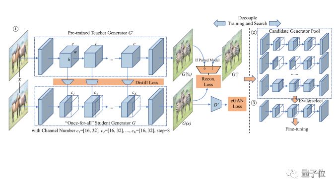 GAN压缩的框架如下图所示,主要分为3个部分:
