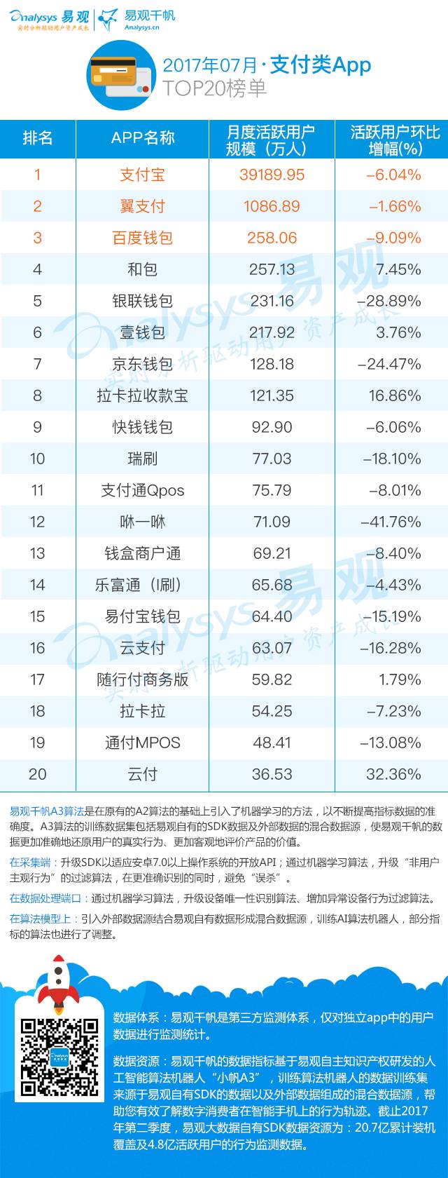 2017年7月金融App基础指标排名出炉,支付行业App活跃用户增长平稳,8家支付企业排名进入前100位。其中,和包和拉卡拉收款宝在月活人数上增长较为迅速。支付宝月度活跃用户总人数达到至3.91亿人,在支付领域月活跃用户数量上继续排名第一。翼支付7月月活达到1087万,排名第二。受电商等行业规模活动后市场趋于平稳影响,部分支付行业App月活人数略有下降。