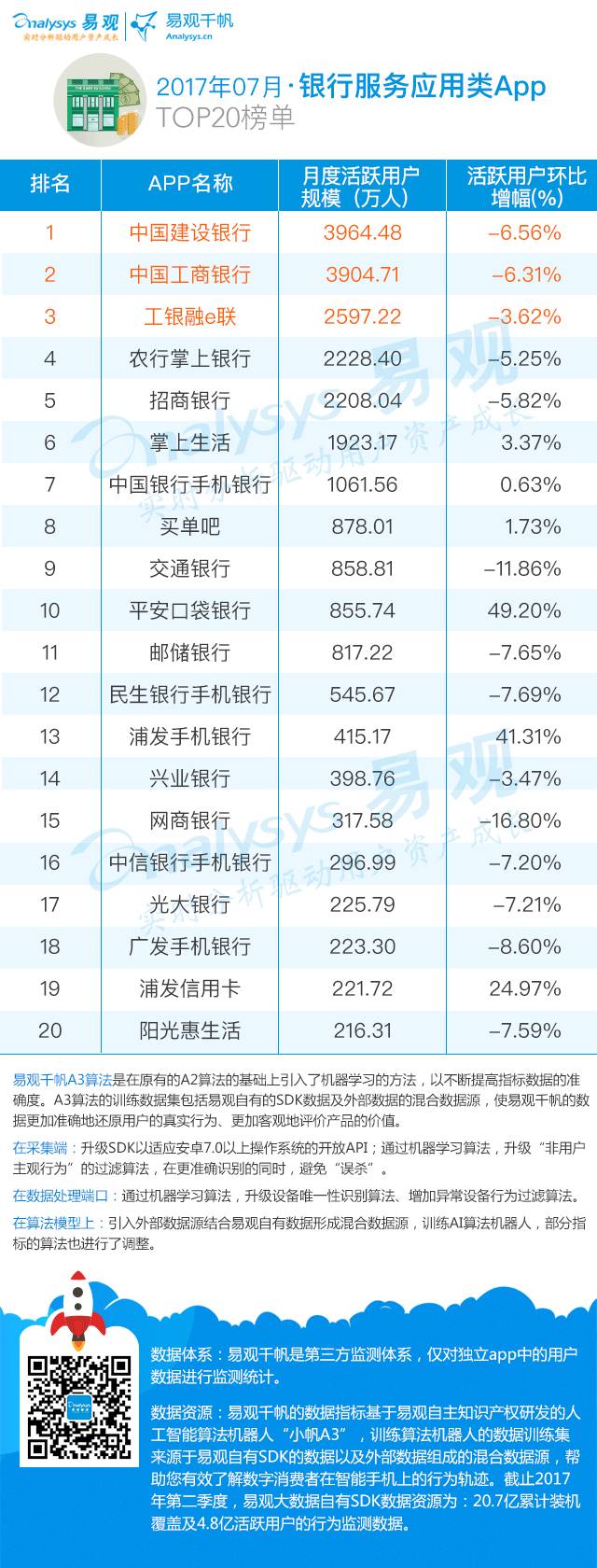 在2017年7月银行服务应用App榜单中,中国建设银行、中国工商银行、工银融e联分别以3964.48万、3904.71万、2597.22万的活跃用户位列前三甲。建设银行手机银行客户数已达2.44亿户,凭借庞大的用户基础、不断完善的服务、丰富的营销活动,建设银行活跃用户稳居首位。