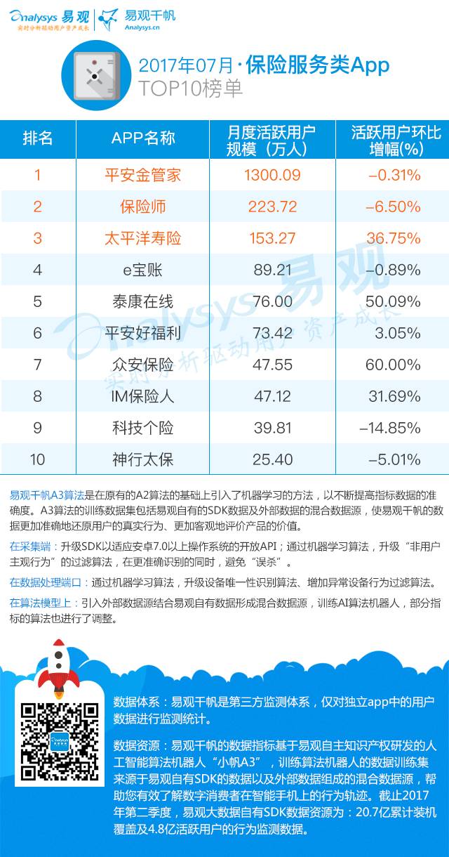 保险服务领域近3个月月度活跃用户规模均维持小幅增长,复合增长率4.07%,总体活跃用户规模1941.32万人。2017年7月仅有平安金管家、保险师、太平洋寿险活跃用户规模超过100万,其中平安金管家以1300.09万活跃用户、66.97%的领域渗透率居于绝对领先地位。排名前10的应用中:仅有5个维持增长状态,增幅最大的是众安保险,达60%,其余均下跌,跌幅最大的是科技个险,下跌-14.85%。
