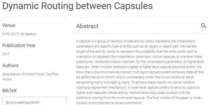 2017 年 10 月 26 日,Hinton 和 Sara Sabour 、 Nicholas Frosst 共同完成的论文《胶囊间动态路由》[6]( Dynamic Routing Between Capsules ),被 NIPS 2017 大会接受。这篇论文正式提出了胶囊( Capsules )的概念,这是一种神经网络的扭曲,旨在让机器通过图像或视频更好地了解世界。其目的在于弥补目前机器学习系统中限制有效性的缺陷。Google 和其他公司目前使用的图像识别软件都需大量的示例照片才能“习得”在各种情况下准确地识别对象的能力。造成这一状况是因为该软件不擅长将学到的东西在新的场景中泛化。比如,同一个物体从新视角观察也可以得出相同的结论。