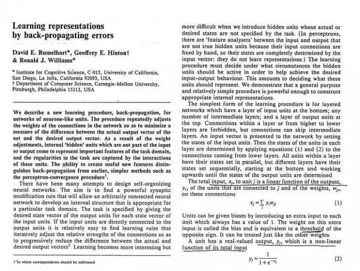 30 年前的 1986 年,Geffrey Hinton 联合同事 David Rumelhart、Ronald Williams 发表了一篇突破性论文《Learning representations by back-propagating errors》[2], 在论文中首次将反向传播算法( backpropagation,简称 backprop、BP )引入了多层神经网络训练。由此开启了人工智能的新纪元,确立了 Hinton 在 AI 界崇高的地位,被誉为“深度学习之父”。正是这个技术让人工智能发展到今天如此炙手可热的地步。事实上,最近十年人工智能领域的每一个成就,如语音识别、图像识别、博弈等,在某种程度上都可追溯到 Hinton 30 年前所做的工作。