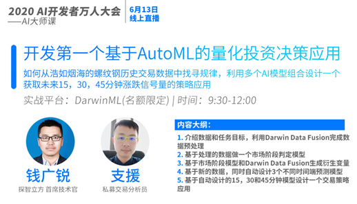在本期的直播中(6月13日,周六上午 9:30),我们邀请到了探智立方首席技术官钱广锐老师和私募交易分析员支援老师带领大家了解如何利用DarwinML平台从浩如烟海的螺纹钢历史交易数据中找寻规律,利用多个AI模型组合设计一个获取未来15,30,45分钟涨跌信号量的决策应用。
