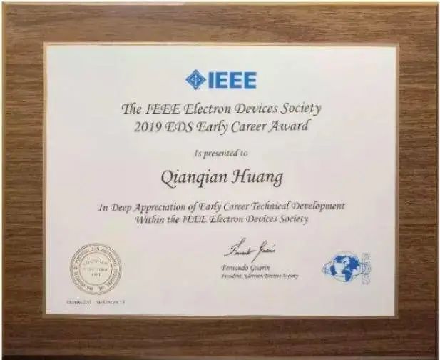 2019 年 10 月,黄芊芊因其在超低功耗微纳电子器件基础研究领域的重要贡献,获得了全球仅 3 人获奖的 IEEE Electron Devices Society Early Career Award(IEEE 电子器件学会青年成