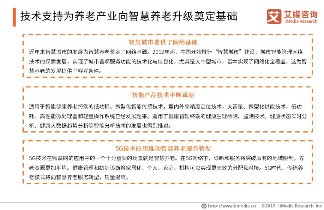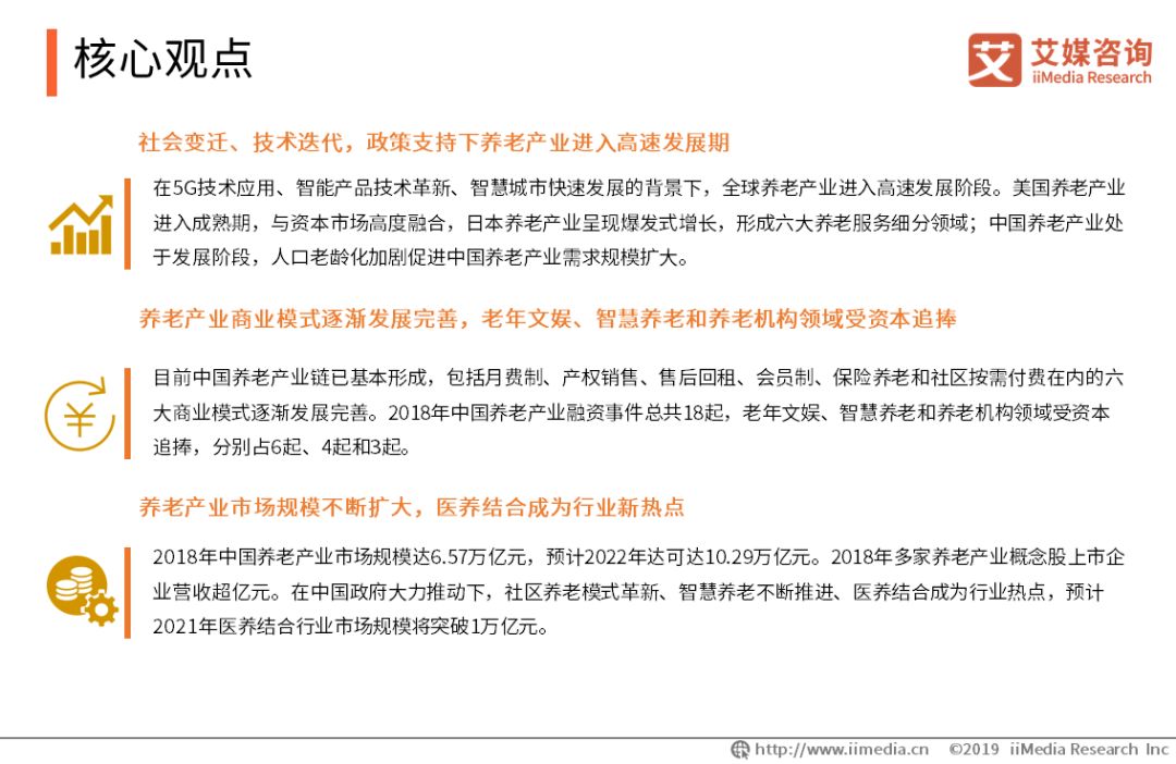 随着人口老龄化的加剧,国家越来越重视养老产业的发展,发布了一系列政策扶持。结合当下养老产业发展状况和养老产业政策热点,艾媒咨询分析师认为,中国政府支持社区养老模式革新、医养结合深化、智慧养老推进和养老金融市场放开等多个方向改革与开发,推动了养老产业发展。
