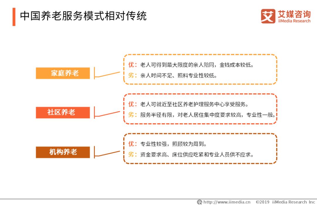 中国的养老产业刚起步不久,尚未探索出真正成熟的模式,也不存在以养老产业为主业的上市公司,养老产业作为一个涉及面较广的新兴市场,有待进一步开发。目前中国的养老服务模式主要分为传统的家庭、机构和社区养老三种。