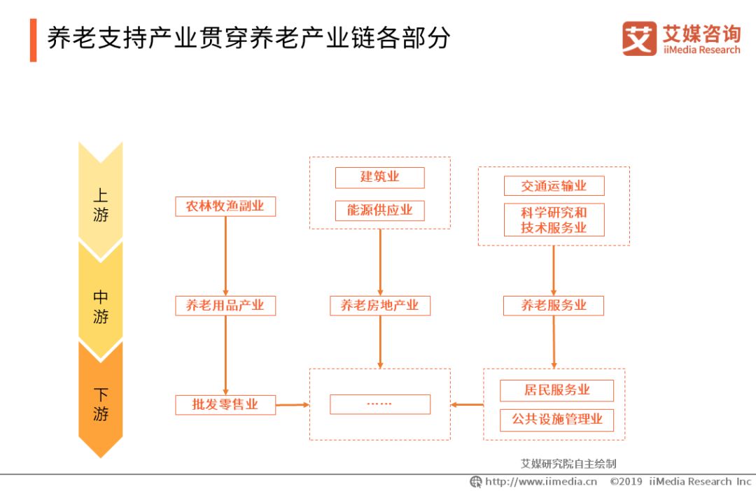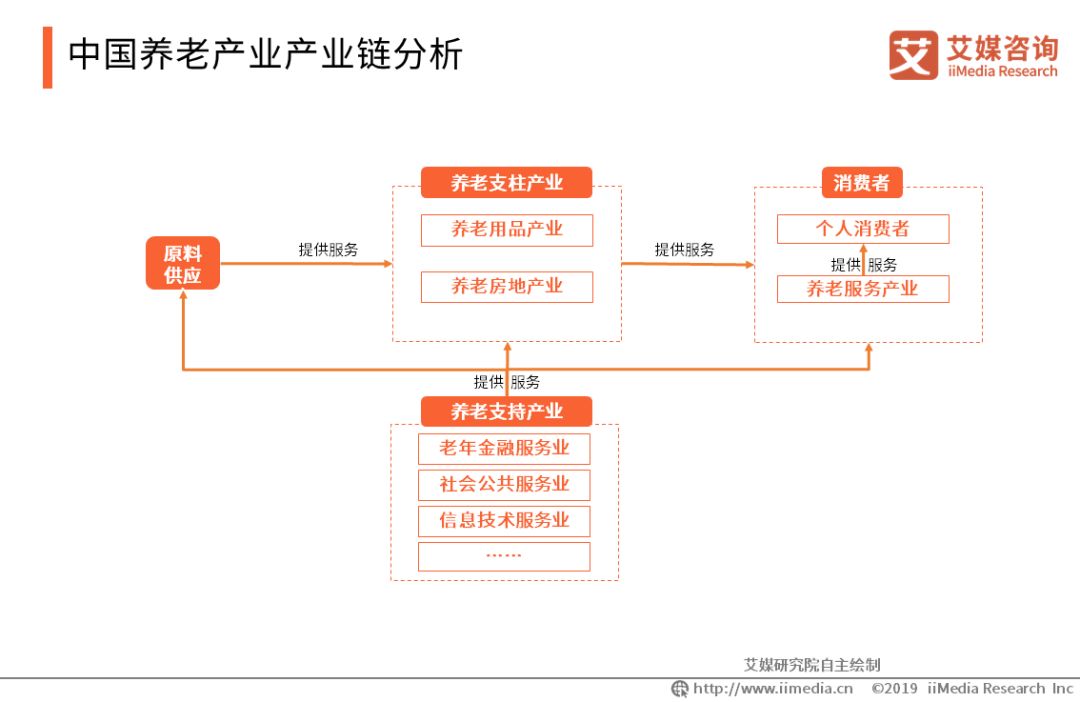 养老产业链覆盖了老年人的基本生活需求、娱乐享受需求和理财规划需求及其关联关系,养老产业能否长效发展取决于养老产业链能否合理衔接。产业链上游为原料和能源等资源供应商,中游为提供养老用品和提供养老场所的养老用品供应商、养老房地产商和养老服务提供商,下游是个人和机构消费者,其中养老机构通常跟养老服务提供商重叠,为个人用户提供服务,养老支持产业提供的服务则贯穿整条产业链。