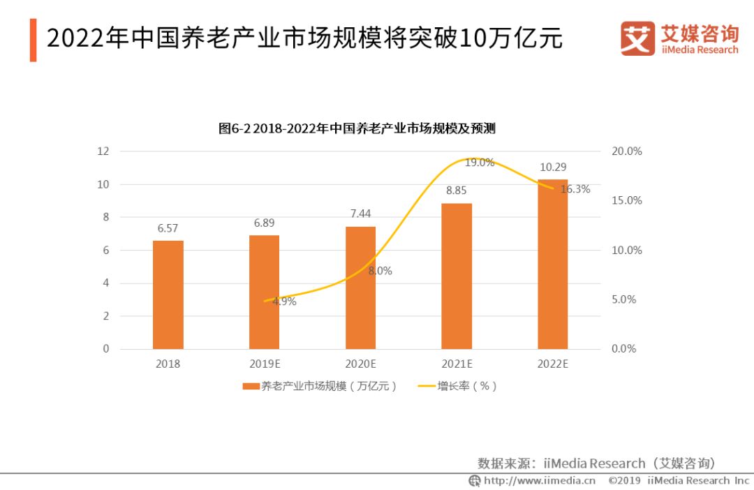 中国养老产业市场规模逐年增长,iiMedia Research(艾媒咨询)数据显示,2018年中国养老产业市场规模达6.57万亿元,预计2022年可达10.29万亿元。
