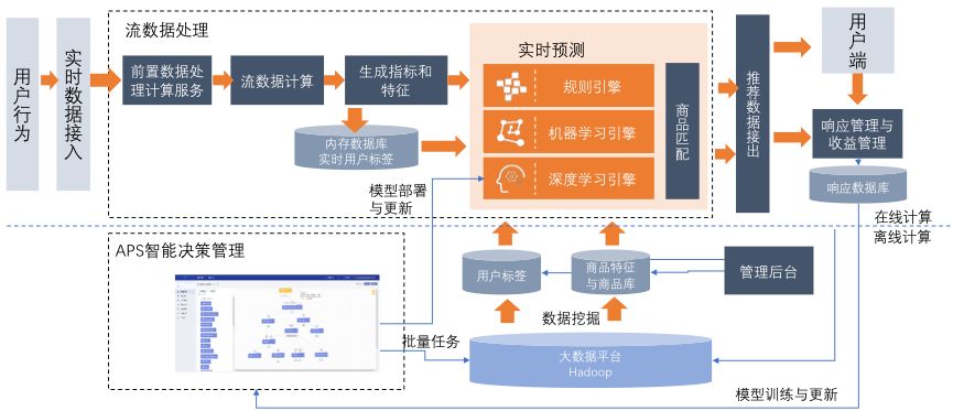 推荐系统的目标是提供个性化的营销推荐建议,并且可以根据用户的实时行为做出实时响应。实际的推荐结果可以直接从离线计算的列表中提供服务,也可以通过在线算法动态生成。