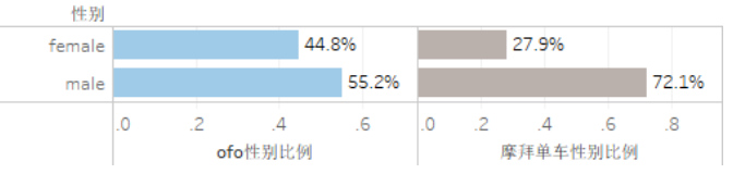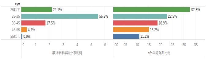 上图反映了两种摩拜单车年龄分布比例的对比,摩拜单车和ofo共享单车均以年轻用户为主。
