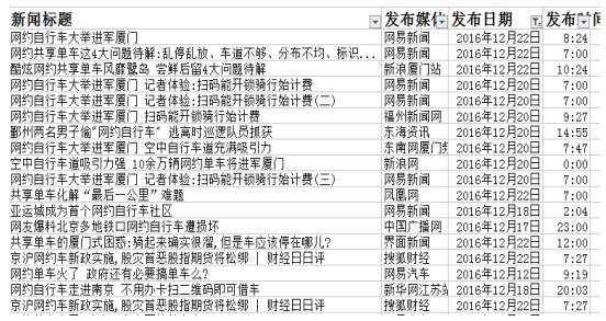 从2015年底一直到现在,各大媒体对共享单车关注的热度日趋高涨,因而分析有关共享单车相关舆情的信息至关重要,这有助于企业了解整个共享单车市场发展的动态和自身存在的问题,同时用户也可以知道当前共享单车对自己短途出行的便利性有没有提高,值不值得继续支持。