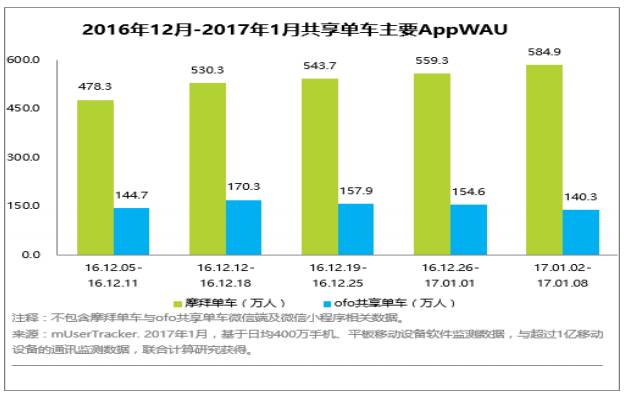 通过分析mUserTracker发布的监测数据,Mobike摩拜单车App与ofo共享单车App用户相对于其他共享单车,规模上占有领先的优势,周度活跃用户(weekly active users),简称WAU,不论是摩拜单车还是ofo共享单车,在2016年12月均已达到百万量级以上,成为移动出行行业中覆盖率较高的应用。不过,下图数据显示,计算出摩拜单车周活跃用户量已经是ofo 4.2 倍,日均总有效使用时间达ofo 3.6倍。