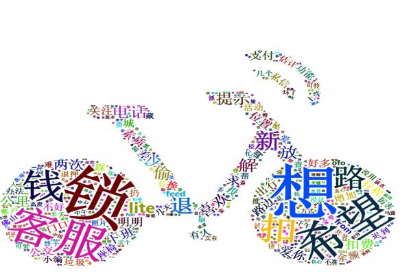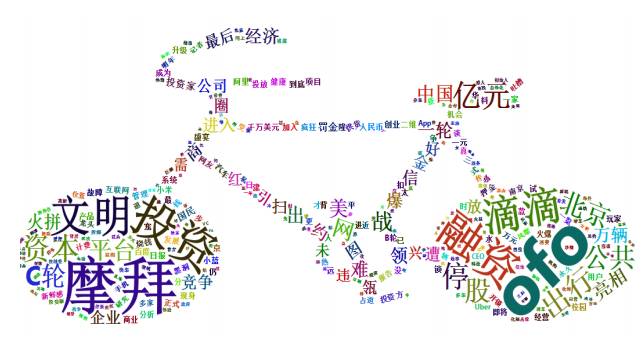 从统计结果看,行业内前十的关键字,70%都是与“钱”相关。媒体非常关注资本市场,换句话说,共享单车兴起不久,现在已演变为资本驱动市场,在资本领域的角逐异常激烈。 “大战”一词的比重颇高,不由得联想到前几年网约车刚兴起,滴滴与快滴之间为争夺市场而引发激烈的价格战。下面通过词云图,可以观察到社会媒体大众现在关注的有关共享单车的热点。首先,对分好词的新闻媒体内容进行词频统计整理,把同义词合并,如“摩拜”与“mobike”都是指摩拜单车,所以合并统计计算,其次,调用R软件的Wordcloud2包,为了使绘制的词云图更加形象,通过wordcloud2()函数中的“figPath”参数读取文件路径中已经存储好的各种共享单车的图片,绘制的结果如下图所示: