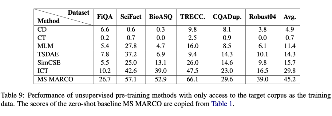 ICT、CD 仅被研究用于域内的性能,即在预训练之后,有大量标签数据用于后续有监督的微调。SimCSE, CT, TSDAE 仅用于无监督的句子向量学习。直接使用利用这些策略学习到的句子表示用来检索,其性能远远不足。