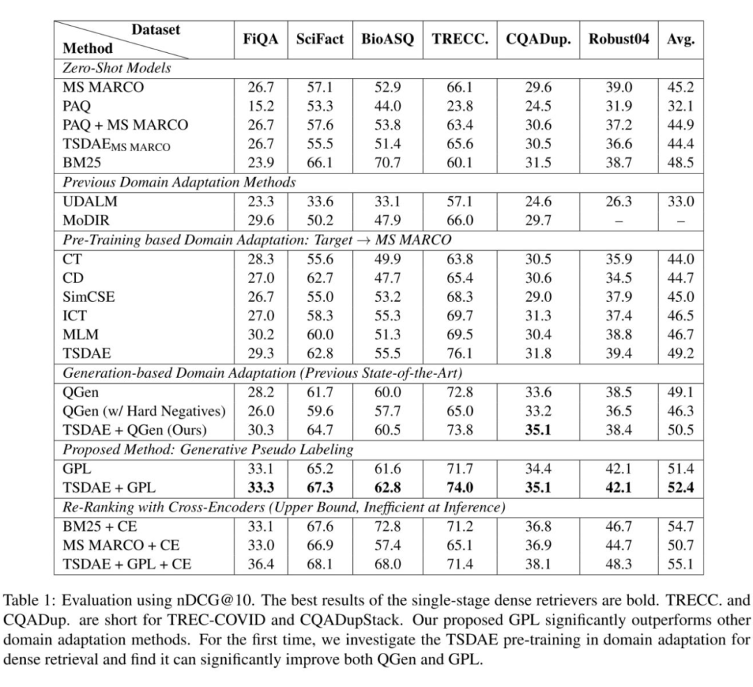 本文针对稠密检索提出了一种先进的无监督领域适应方法 Generative Pseudo Labeling(GPL),使用 query 生成模型与基于 cross-encoder 的匹配模型为目标域构造伪标签。