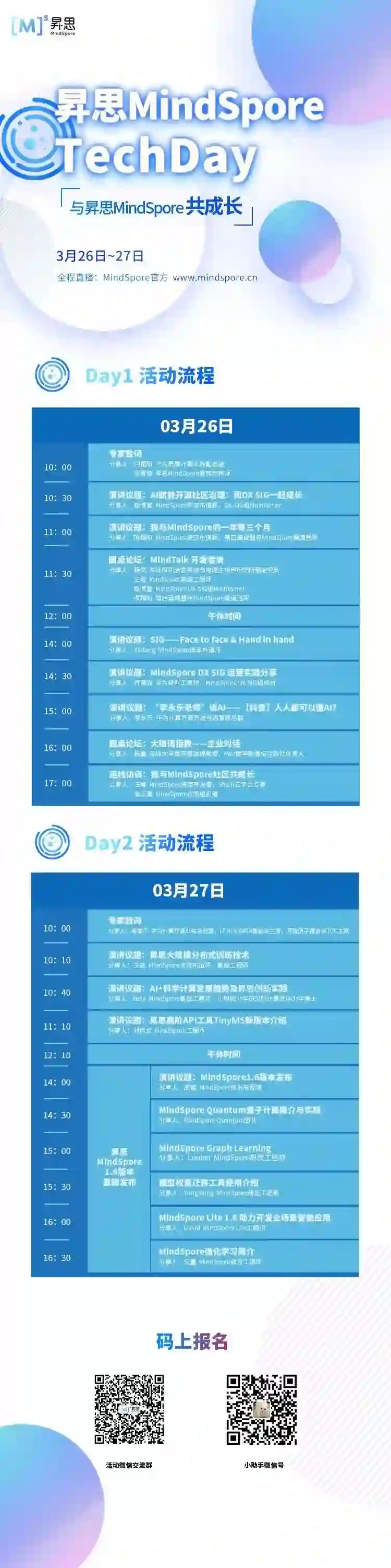 昇思MindSpore作为华为开源的全场景AI框架,具备开发友好、运行高效、部署灵活等优势,目前已应用于医疗、金融、制造等多领域,支撑基础科研实现创新突破;2021年下载量超百万,并在1000多万个码云开源项目综合排名第一,是国内热度最高的AI开源社区。2022年3月26日-27日,昇思MindSpore社区举办年度TechDay,将带来技术升级、社区分享、实操干货、大咖经验分享等精彩内容,为AI开发者献上一场“饕餮盛宴”。